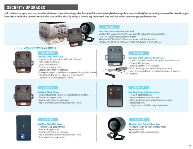 All Excalibur security systems are compatible with these state-of-the-art upgrades. From wheel/tire protection to glass breakage detection to proximity/motion sensing for convertibles & soft tops, you